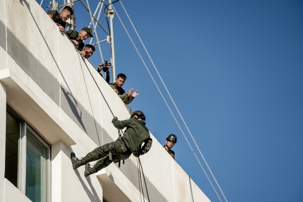 Không chỉ vậy, các chiến sĩ nhập vai còn được huấn luyện bài kỹ thuật sử dụng dây chiến thuật, đột nhập, đánh bắt mục tiêu trong tình huống chiến đấu. Đây là kỹ năng đặc biệt, yêu cầu cao cả về sự tập trung, khả năng kiểm soát cơ thể lẫn bản lĩnh tinh thần. Các nghệ sĩ phải thực hành hai tư thế: xuống xuôi và xuống ngược.