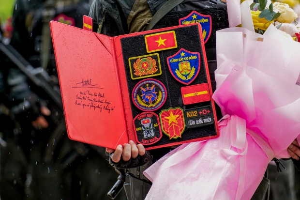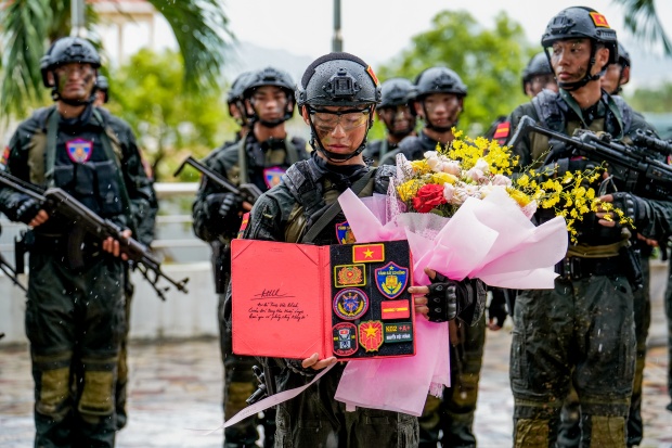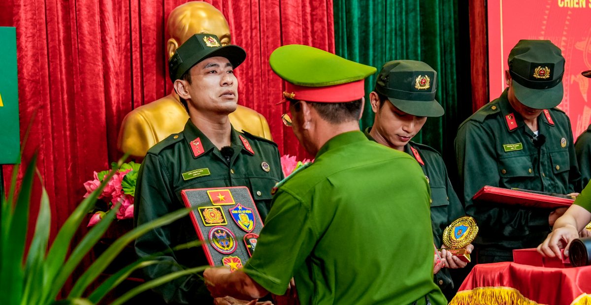 Không chỉ bằng những lời biểu dương, Đại tá còn trao tặng cúp vàng, kỷ niệm chương, những miếng dán ký hiệu độc nhất cùng nhiều món quà lưu niệm ý nghĩa. Đây không chỉ là kỷ vật, mà còn là dấu mốc nhắc nhở về những ngày tháng khổ luyện trong vai trò người chiến sĩ Cảnh sát cơ động.