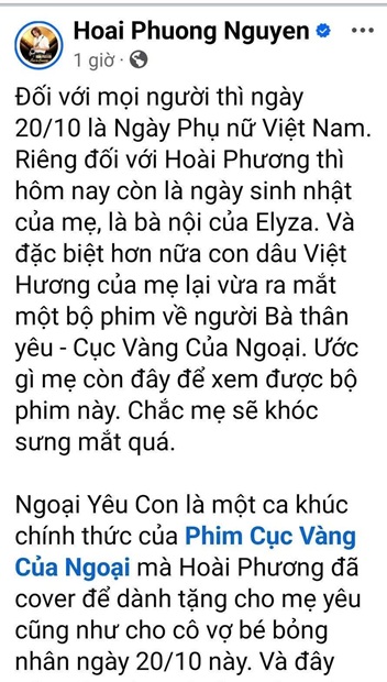 Vì cận kề ngày Phụ Nữ Việt Nam 20/10, đạo diễn Khương Ngọc cũng đã dành tặng nhiều lời chúc tốt đẹp nhất đến với các bà, các mẹ, các chị và các em. Riêng diễn viên Việt Hương được chồng mình – nhạc sĩ Hoài Phương cover ca khúc “Ngoại yêu con”, nhạc phim Cục Vàng Của Ngoại dành tặng nhân ngày đặc biệt này. Việt Hương tiết lộ: “Ông xã ngày nào cũng tập tành và thực hiện món quà này để dành tặng cho tôi. Thật sự rất thương và cảm động”. Nhạc sĩ Hoài Phương cũng đã có những chia sẻ riêng: “Ngày 20/10 là ngày Phụ Nữ Việt Nam nhưng đối với Phương còn là ngày sinh nhật của mẹ, là bà nội của Elyza. Và đặc biệt hơn nữa, con dâu Việt Hương của mẹ lại vừa ra mắt bộ phim về người Bà thân yêu – Cục Vàng Của Ngoại. Ước gì mẹ còn đây để xem được bộ phim này. Chắc mẹ sẽ khóc sưng mắt quá. ‘Ngoại yêu con’ là ca khúc chính thức của phim Cục Vàng Của Ngoại mà nhạc sĩ Hoài Phương đã cover để dành tặng cho mẹ yêu cũng như cho cô vợ bé bỏng của mình”.
