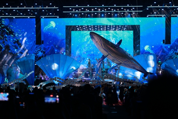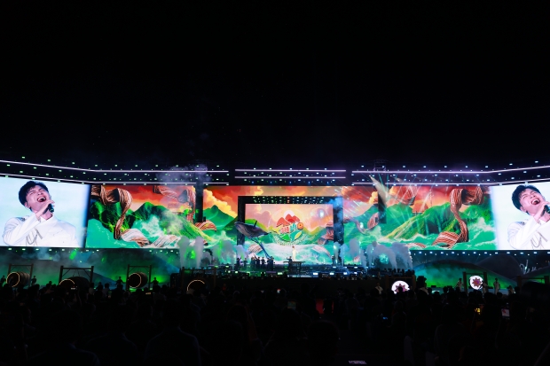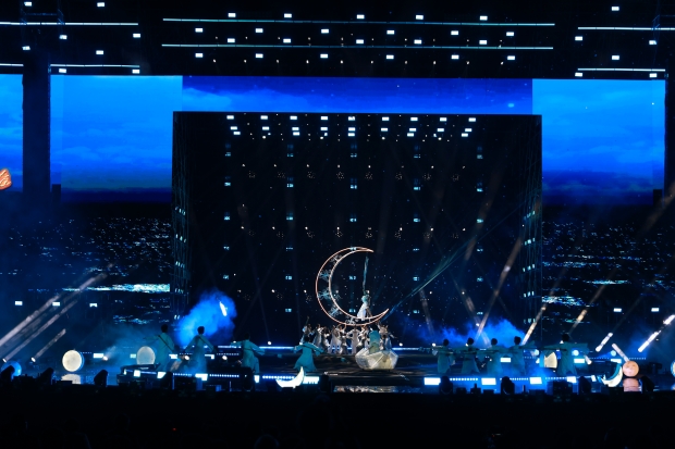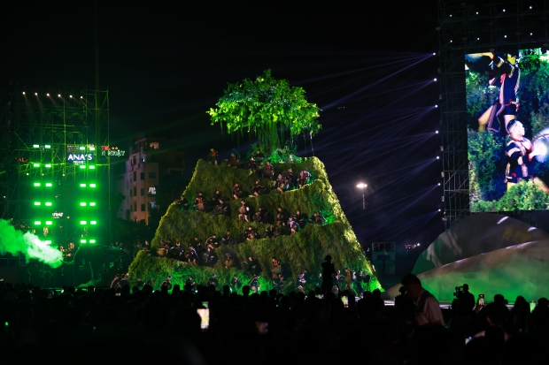 Ngay từ những phút đầu tiên, sân khấu đã gây ấn tượng mạnh với thiết kế đa tầng kết hợp màn hình LED, hiệu ứng ánh sáng và không gian trình diễn mở rộng theo chiều sâu. Thay vì một sân khấu biểu diễn đơn tuyến, toàn bộ khu vực được dàn dựng như một bức tranh chuyển động liên tục – nơi mỗi chương nghệ thuật mở ra một lớp cảm xúc mới, dẫn dắt khán giả đi qua hành trình kết nối từ đại ngàn đến biển xanh.